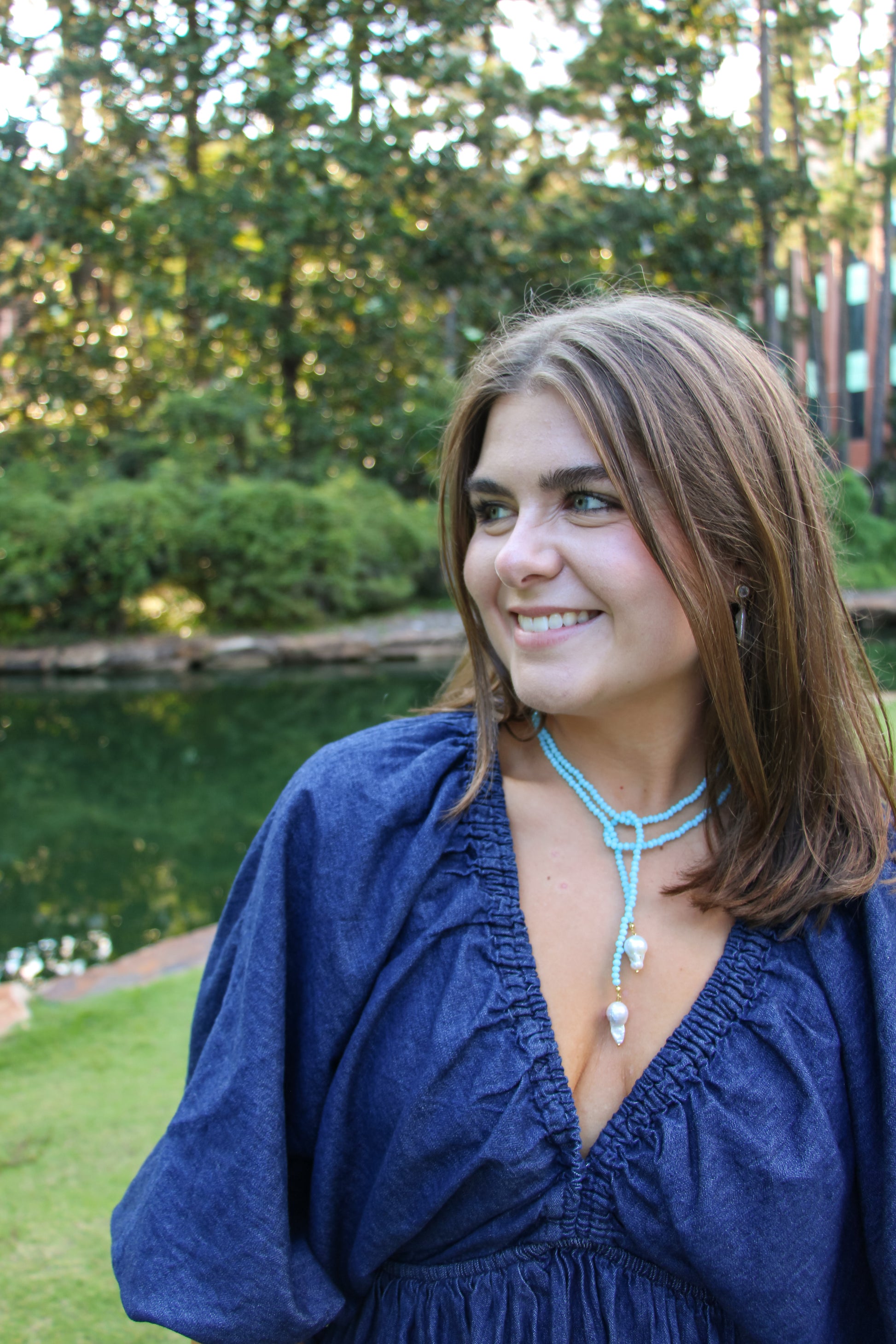 Your new Gameday Go-To! The Wrap Pearl can be worn in a variety of styles, with handcrafted 3mm beads and two baroque freshwater pearls. 14k gold plated accents and over 30' in length.