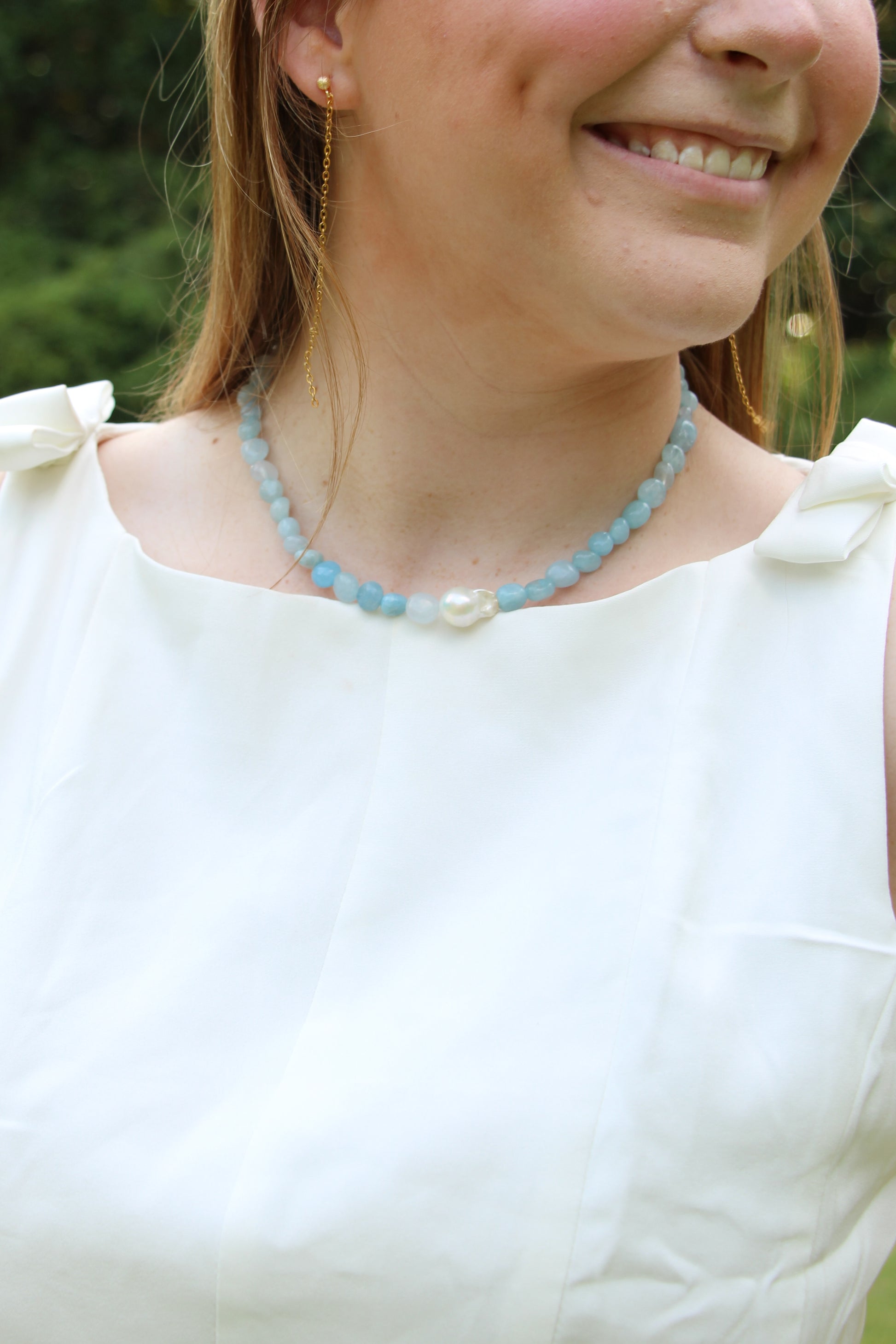 Dyed quartz beads with baroque freshwater pearl at center. 16-18' in length with gold plated adjustable clasp at back.