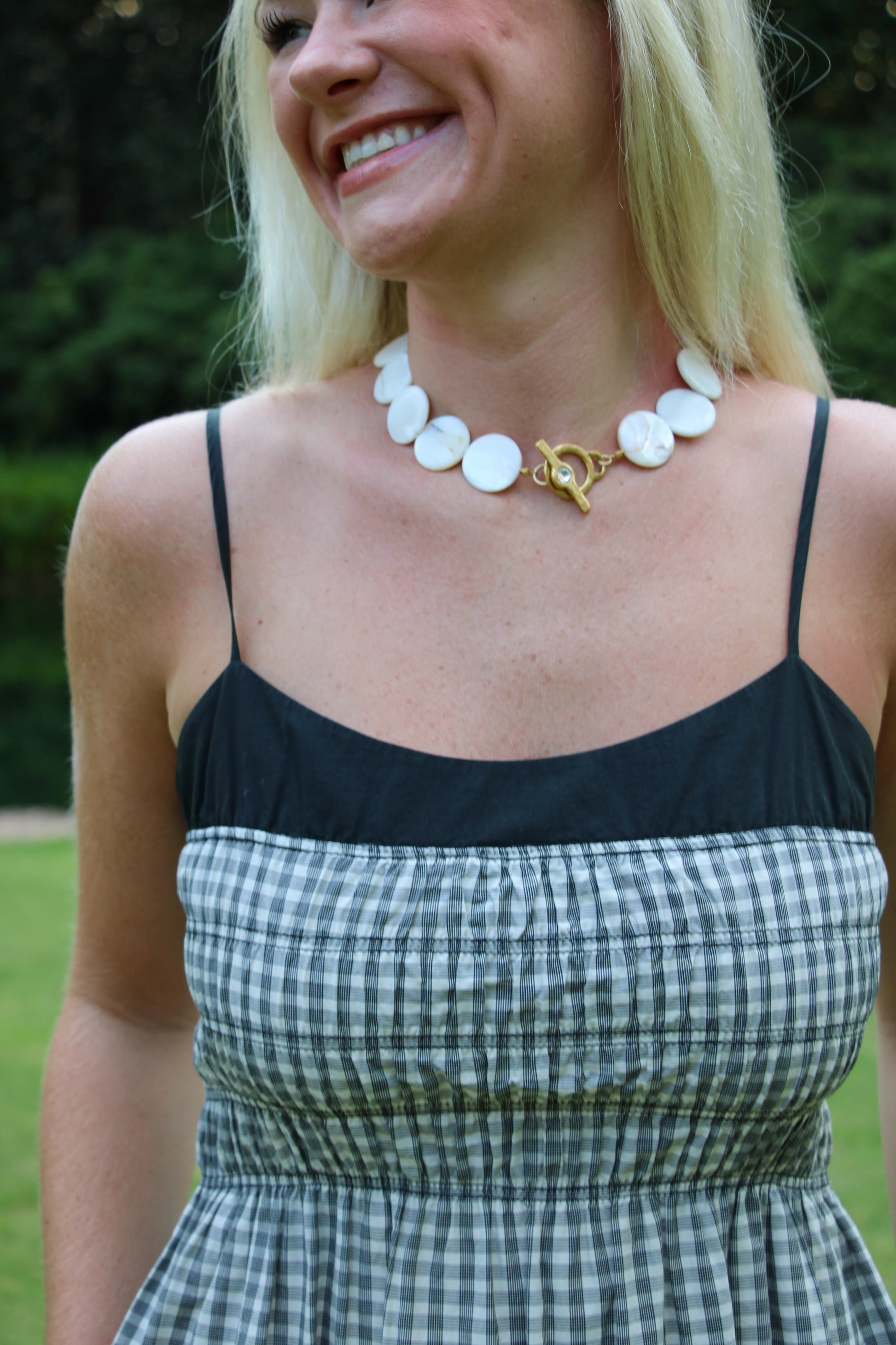 Perfect for gameday, whoever you cheer for! Mother of pearl beads with 14k vintage gold clasp attachment at front. Approximately 16'.