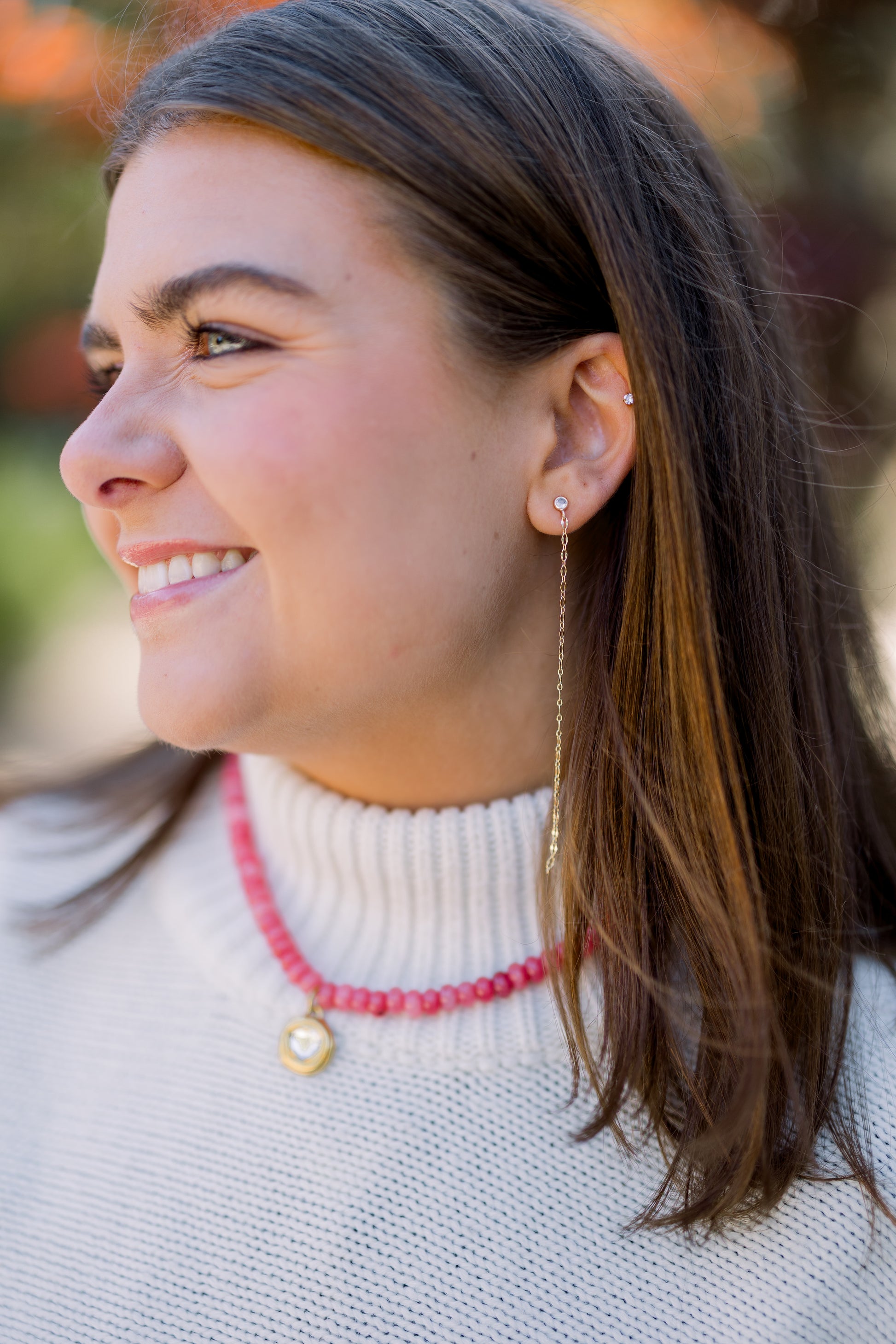 Opalite beads paired with faux 12k vintage gold plated heart diamond charm. Adjustable clasp at back.