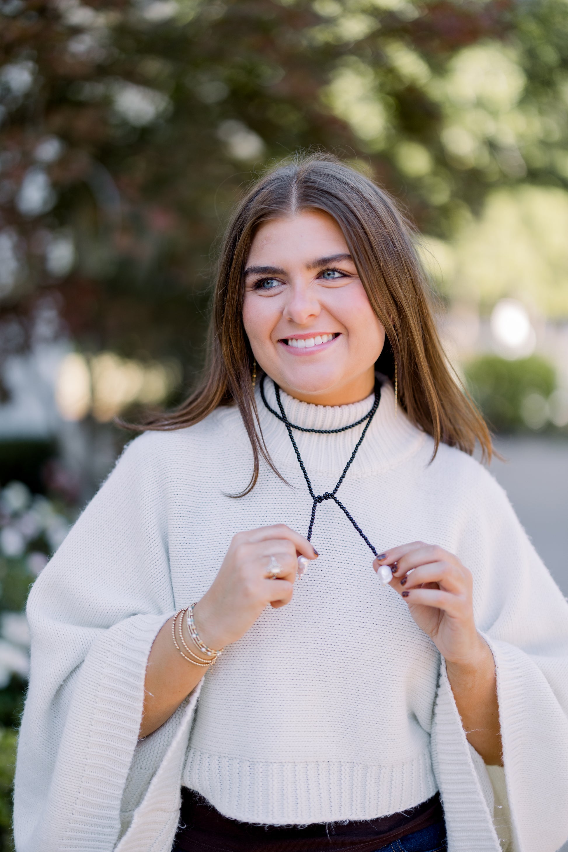 Black round beads with gold plated findings and freshwater pearl attachment. Perfect for layering!