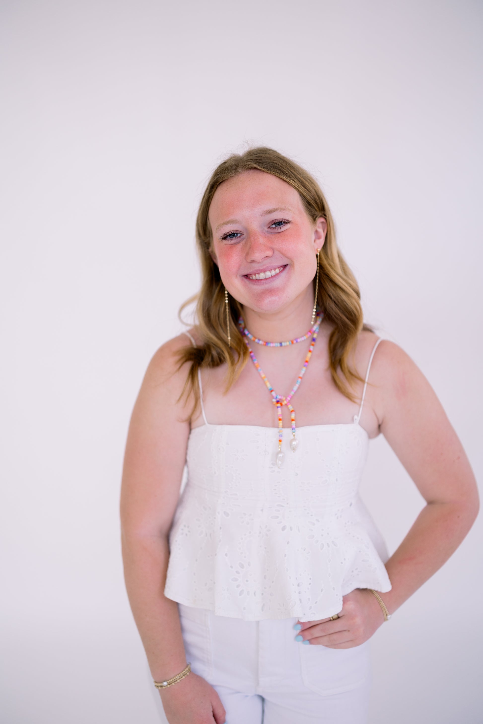 The funfetti version of a classic! The Wrap Pearl can be worn in a variety of styles, with handcrafted 3mm beads and two baroque freshwater pearls. 14k gold plated accents and over 30' in length.