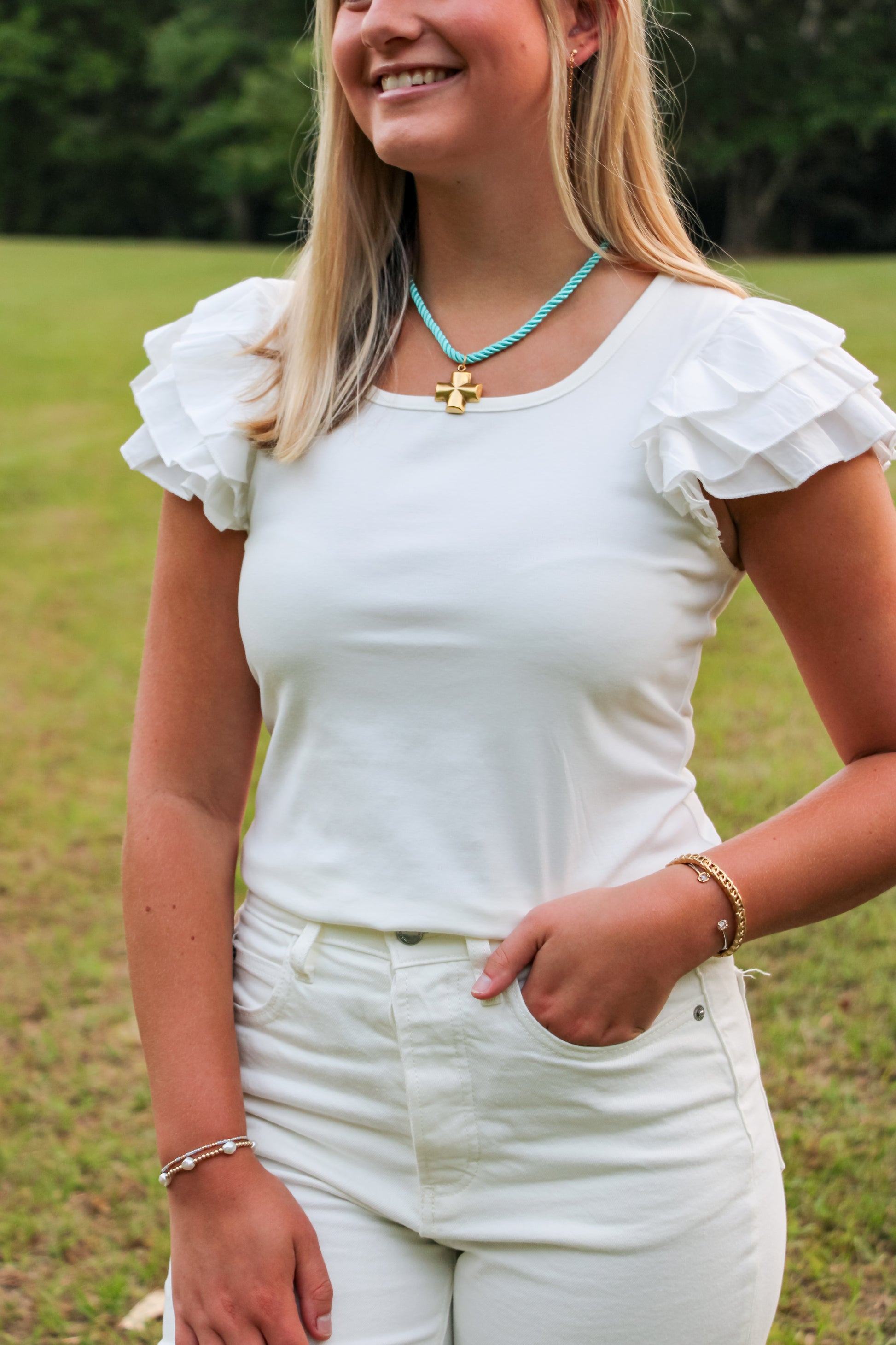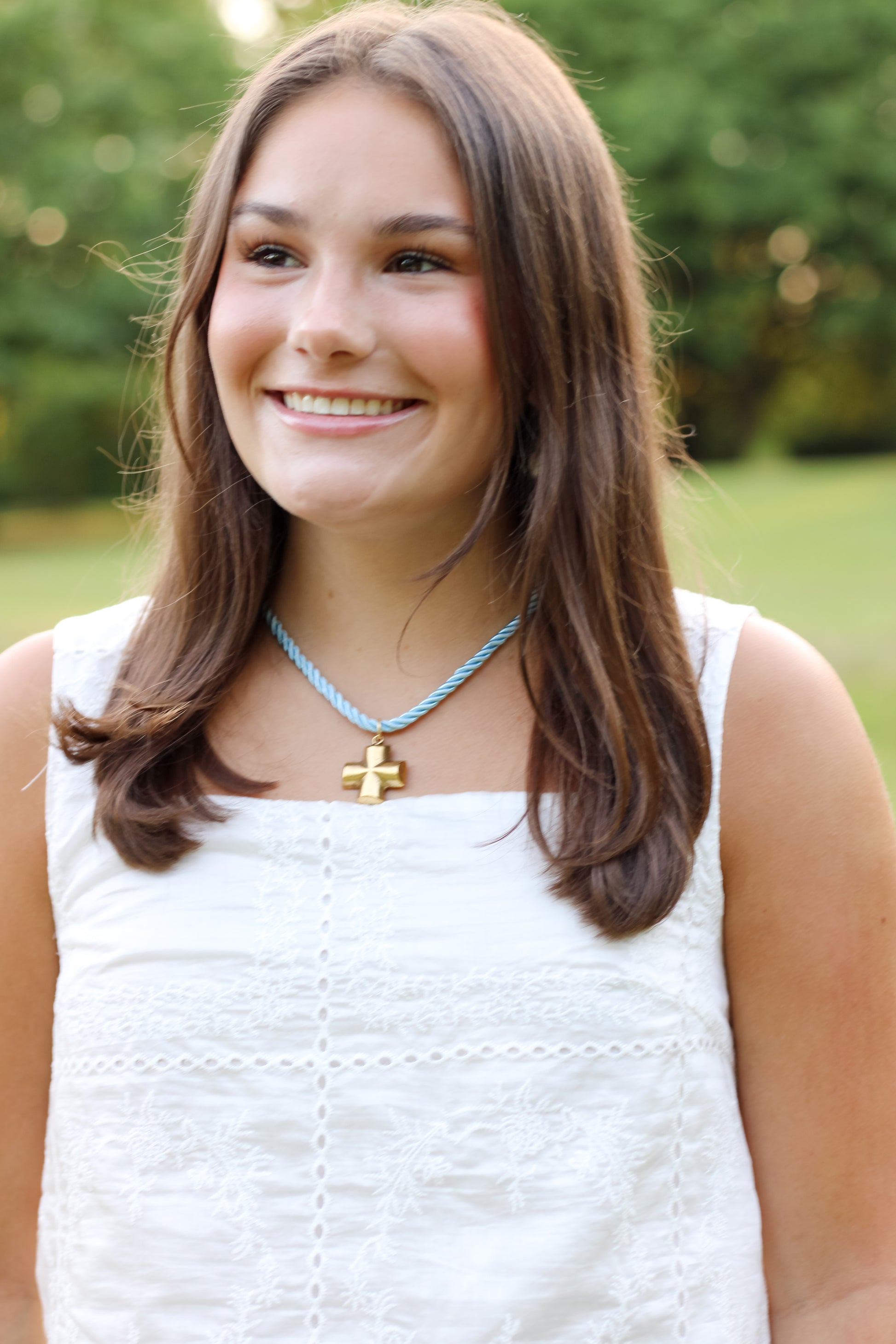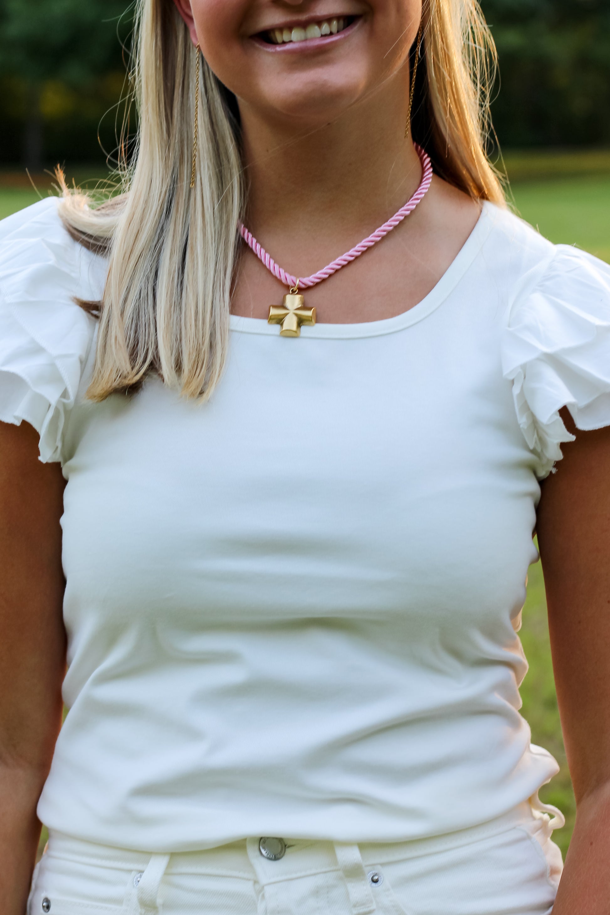 A new take on an all-time favorite! Add a pop of color to your collection with the rope charm! Available with 12k vintage gold plated cross charm in a variety of colorways.