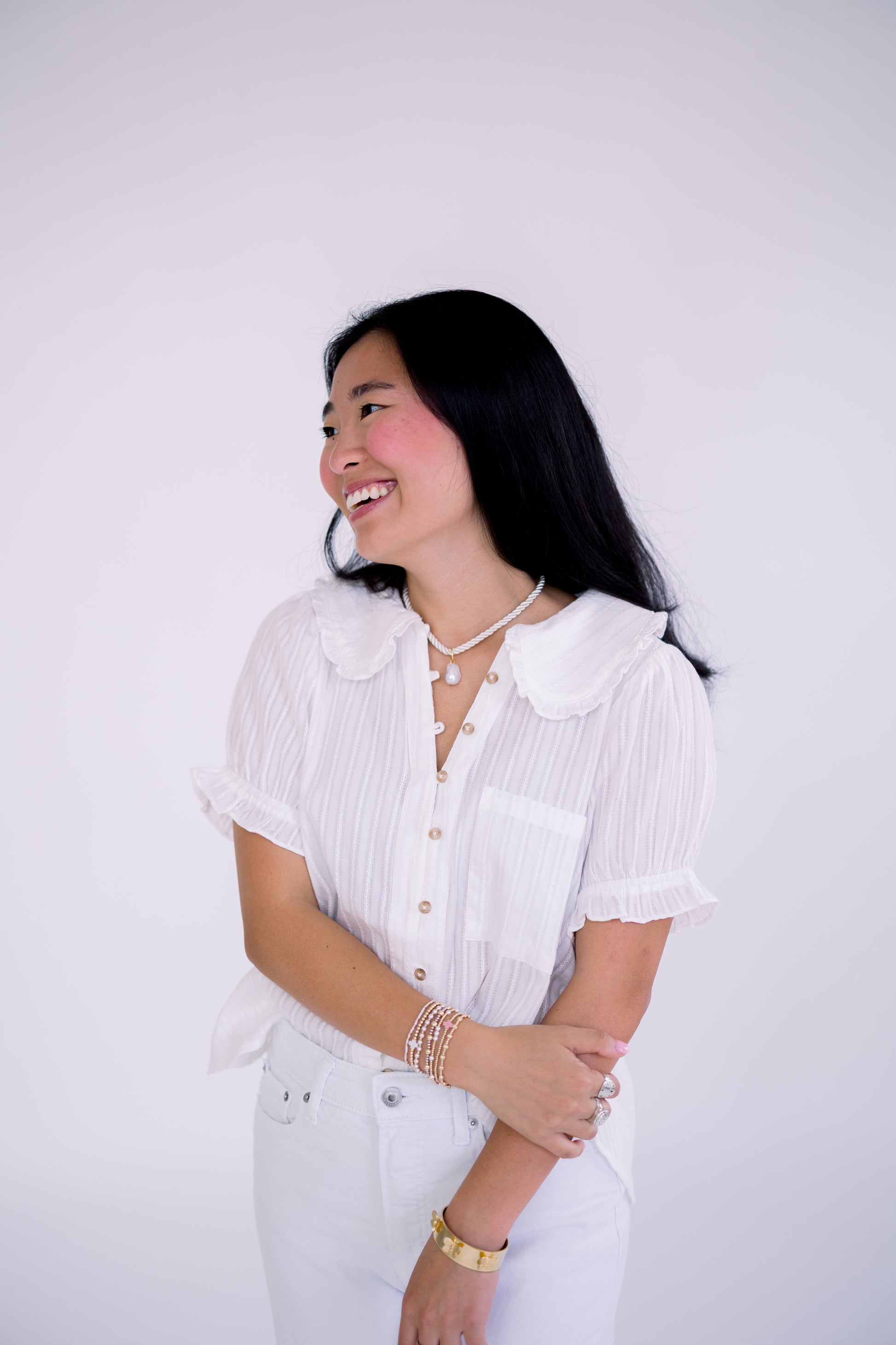 Real freshwater pearl on rope necklace. 15-17' in length with adjustable clasp at back. Contains sterling silver and gold plated findings.